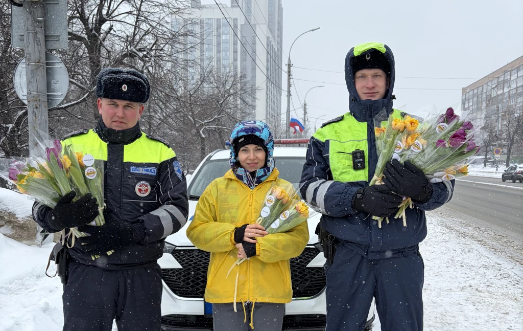 Инспекторы ДПС останавливали автомобили под управлением прекрасной половины человечества и, вместо привычной проверки документов, дарили цветы и сувениры от «Дорожного радио».
